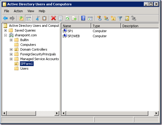 But first we need an Organizational Unit on which to apply the Group Policy. You should be doing this already, but you can see below I have an OU called SPFarm1, that contains the two machines in that Farm: