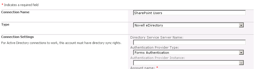 We need to start over by clicking the Create New Connection button on the Synchronization Connections page. Make life easy by going out and back in – this page can get mighty confused! Enter a Connection Name and once again select Novell eDirectory from the Type combo box. Notice that the Authentication Provider Type combo is Forms Authentication and the one we want to use is disabled again.